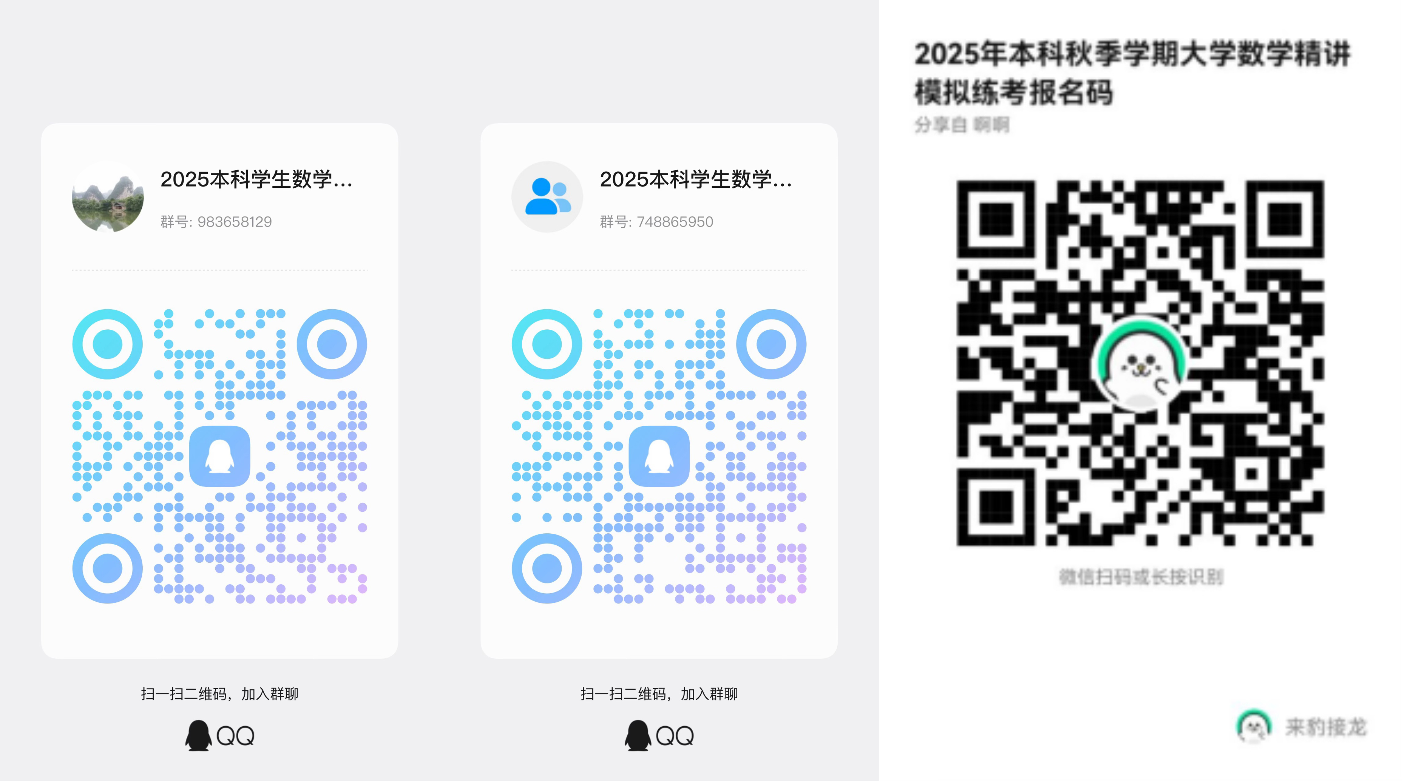 2.请报名参加秋季模拟练考学习的同学扫描报名二维码,填写个人信息报名,并加入咨询群:983658129(已满)、748865950(根据报名人数准备模拟试卷)。前期线上未参加学习的同学我们会将其加入大学数学精讲线上学习通班级,可自行补修前期课程内容。报名截止时间为2025年11月4日16:00时。