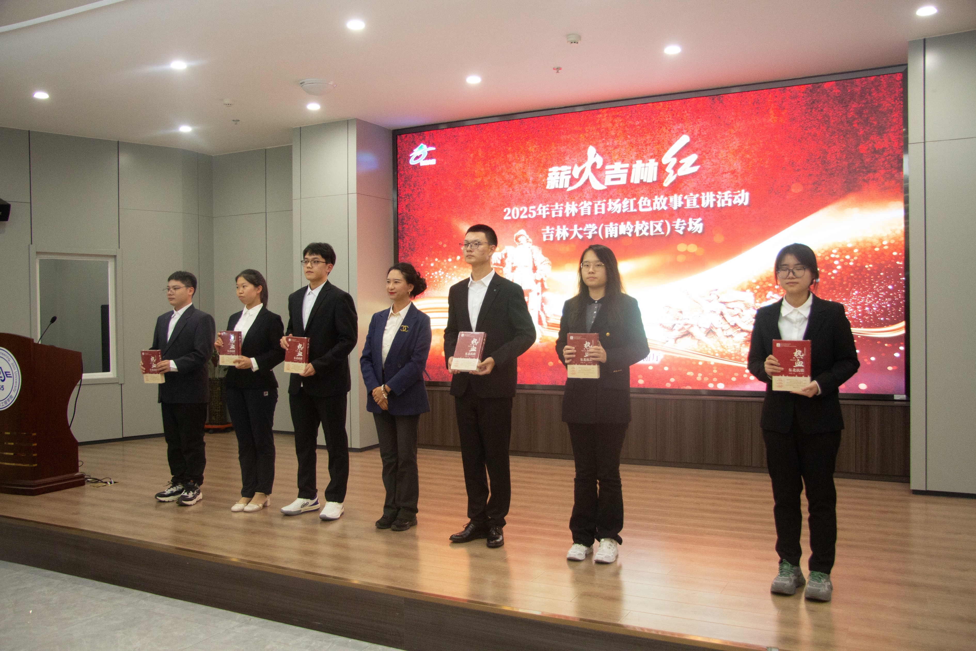 本次宣讲活动的第一个环节为党委学生工作部向吉林大学南岭校区各学院党员学生代表赠送学习书籍,丰富校园红色文化资源,为青年学子搭建便捷的红色阅读平台。第二个环节由宣讲员们深情讲述红色故事,带领同学们重温英雄史诗。《将军的口琴》以杨靖宇将军生前珍爱的口琴为线索,通过口琴声引入、情景还原与深情讲述,展现了这位钢铁将军在冰天雪地中不屈不挠的战斗意志和内心深处对家国、对战友的无限柔情。《满门忠烈王凤阁》讲述了抗日英雄王凤阁携全家与日寇浴血奋战,被俘后坚贞不屈壮烈牺牲的英雄事迹。《小巷总理谭竹青》通过朴实而真挚的语言,讲述了这位扎根基层40余年,用“辛苦我一人,幸福千万家”的无私奉献精神,温暖了无数社区居民的平凡英雄谭竹青。《战地小百灵金锦女》讲述了年仅14岁的朝鲜族小姑娘,在抗日战场上用歌声鼓舞士气、传递情报,最终为掩护战友而壮烈牺牲的英勇事迹,引发了在场青年学子的强烈共鸣。《心有大我,至诚报国——黄大年》讲述了时代楷模黄大年教授放弃国外优渥生活,毅然回国投身科研,用生命书写“振兴中华,乃我辈之责”的感人事迹。当讲到黄大年在病床上给外孙女取名春伦,意为长春与伦敦时,不少师生眼眶湿润。来自我校的学生代表李雨航讲述了新中国汽车工业奠基人饶斌的创业历程,从一穷二白到造出新中国第一辆国产轿车,饶斌和一代代汽车人用“敢为人先、自力更生”的工匠精神,托起了民族工业的脊梁。