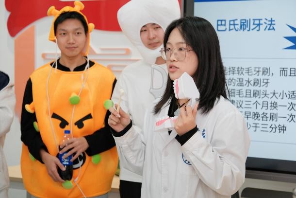 口腔科普剧率先点燃现场气氛,学生志愿者化身“牙齿卫士”“龋齿病菌”,以生动诙谐的剧情演绎不良刷牙习惯引发的口腔问题,将“早晚刷牙、饭后漱口”“定期洁牙”等核心护齿知识点巧妙融入台词。台下师生看得津津有味,不时跟着剧情模仿正确护齿动作,现场掌声与笑声交织,科普氛围轻松热烈。